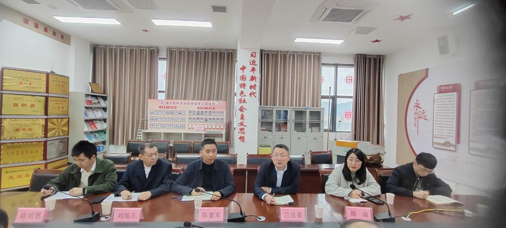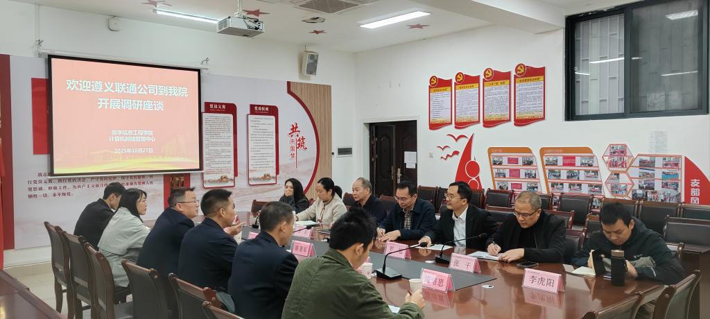 2025年10月27日,中国联通遵义分公司总经理兰宣豪一行6人赴公司开展座谈,围绕员工实习、科研项目申报、实验室共建、智慧校园建设等领域展开深入交流。公司党委书记李岩,副经理罗旭,党委副书记刘畅及校计算机网络管理中心副主任张干,员工办、教务科相关负责人出席。党委副书记、经理王晓华主持会议。
