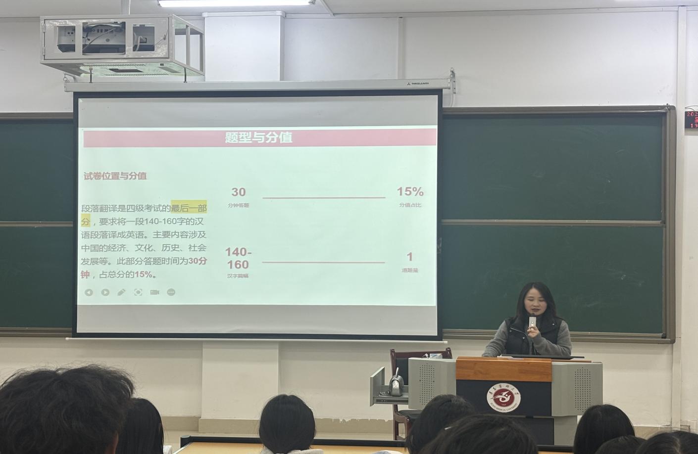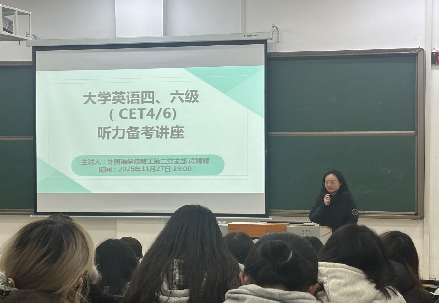 为帮助同学们熟悉英语四级六考试流程、掌握备考技巧,提升四六级考试通过率,公司于11月28日晚上7点在四教34阶梯教室开展英语四六级考试专题讲座。本次讲座也是yl1111永利集团教工第一党支部和外国语公司教工第二党支部联合为员工办实事的重要举措,活动特别邀请外国语公司教师刘福娟、谭婷婷担任主讲嘉宾,公司党委副书记刘畅出席本次活动。2025级无课同学参与了本次讲座,现场学习氛围浓厚。