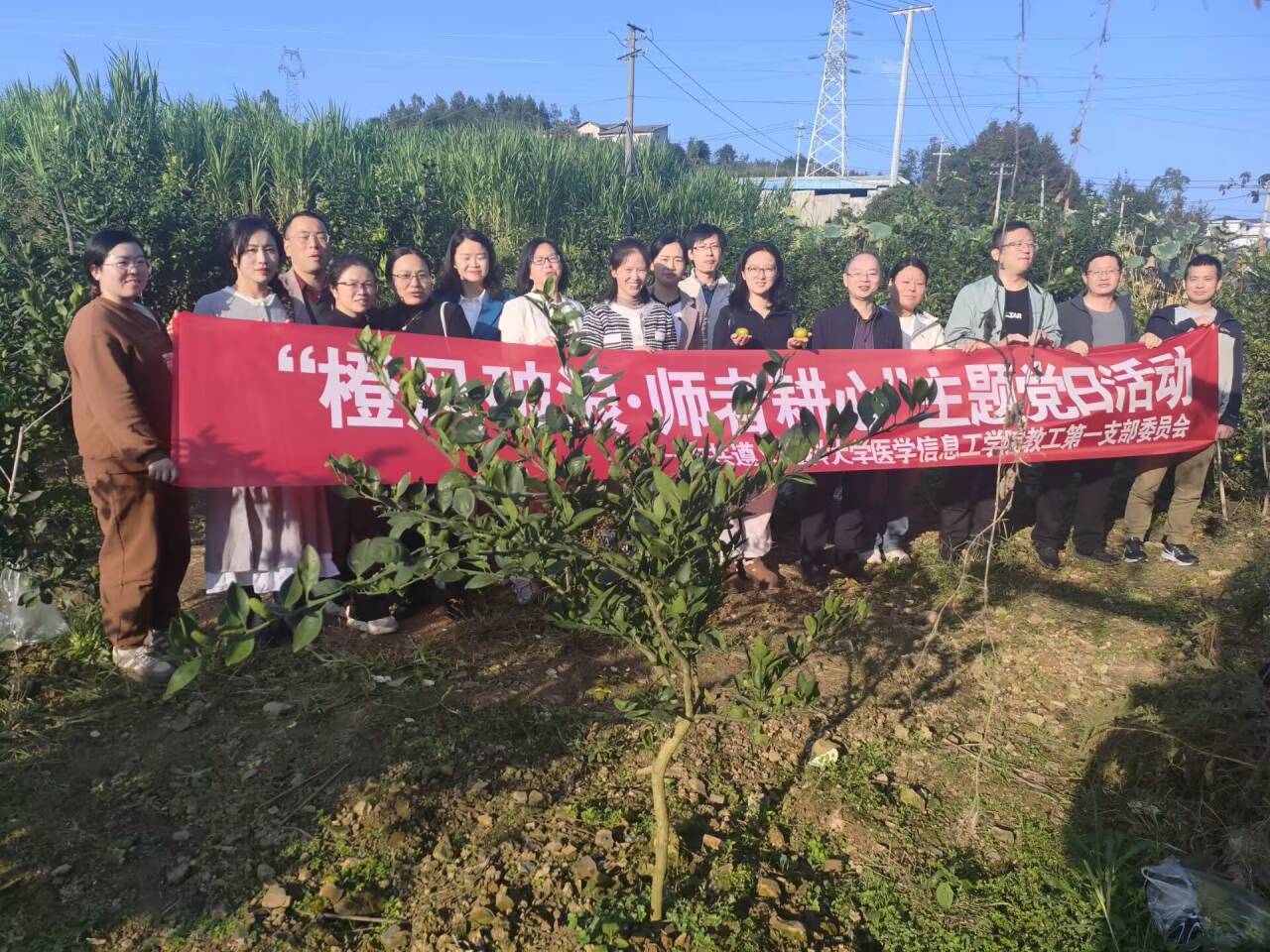 活动第三阶段:“橙风破浪·师者耕心”农庄实践 ,医信教工第一党支部通过柑橘采摘、劳动体验、田间交流等形式,将活动场景从室内延伸至户外,寓教于行。在协作劳动中增强了支部凝聚力,促进了党员与非党员教师的沟通融合,激励全体教师以更饱满的热情践行立德树人根本任务,深耕教育事业。