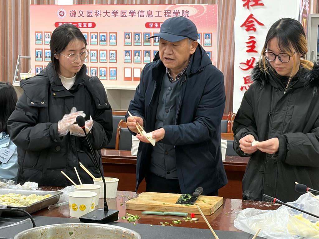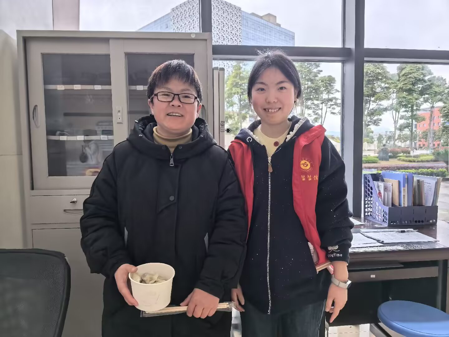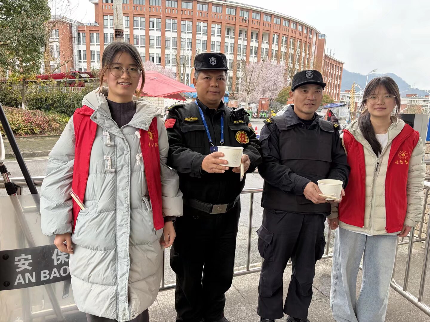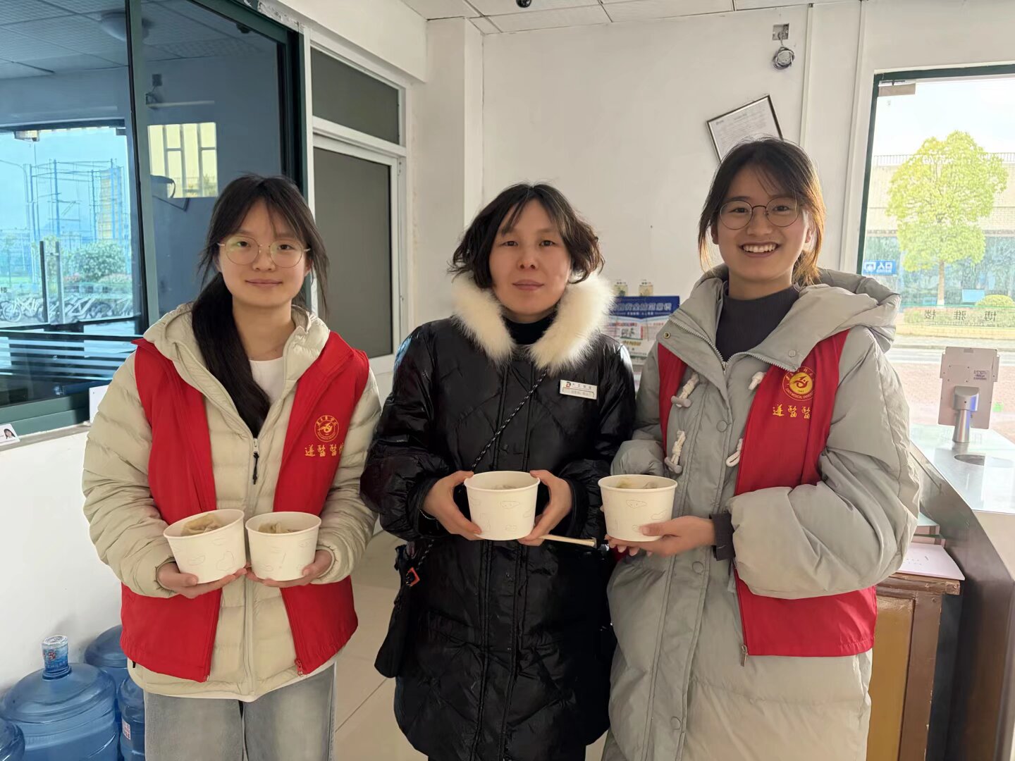 活动现场暖意融融,师生志愿者分工协作,揉面、包馅、搓圆,巧手制作出饱满饺子与圆润汤圆,欢声笑语中洋溢着团圆与温暖的美好氛围。大家将热气腾腾的美食细心分装,将亲手制作的饺子与汤圆逐一送至校内宿管阿姨、门卫保安、保洁人员等后勤岗位员工手中,并送上节日祝福,一碗碗热腾腾的食物不仅传递了节日祝福,更承载着一份温暖的青春善意。